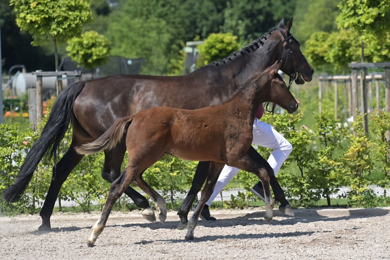 This beautiful and very correctly built dressage stallion was born on March 10, 2025. He is an embryo transfer foal from the famous Vitalos. The mother of the foal, Quality Time, is 10 years old this year and is an Oldenburg elite mare - Pedigree: Quantensprung/Placido. Quality Time has been successfully competing in dressage for years and has won all competitions in 2025 so far, achieving scores of 69-70% in M**, S*, and S** classes. She is currently nearly ready for S*** and will make her debut at this level this season. Quality Time was also qualified for the Bundeschampionat as a 5-year-old. With this beautiful and talented stallion foal, you are securing the future! The sale is directly from the breeder. The mother is also with us and can be viewed. !! The mare that the foal is at foot with is not the genetic mother but a surrogate mother. The ridden black mare in the videos/pictures is the genetic mother. Additionally, we are selling a full sister to this foal, born on March 23, 2025.