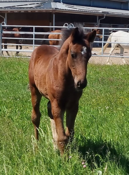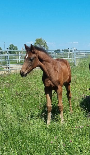This beautiful and very correctly built dressage stallion was born on March 10, 2025. He is an embryo transfer foal from the famous Vitalos. His mother, Quality Time, is 10 years old this year and an Oldenburg Elite Mare - Pedigree: Quantensprung/Placido. Quality Time has been successfully competing in dressage for years and has won all her tests in 2025 so far. M**, S*, and S** all with scores of 69-70%. She is currently nearly S*** ready and will make her debut at this level this season. Quality Time was also qualified for the Bundeschampionat as a 5-year-old. With this beautiful and talented stallion foal, you are securing the future! Sale is directly from the breeder. The mother is also with us and can be viewed. !! The mare that the foal is at foot with is not the genetic mother but a surrogate mother. The ridden black mare in the videos/pictures is the genetic mother.