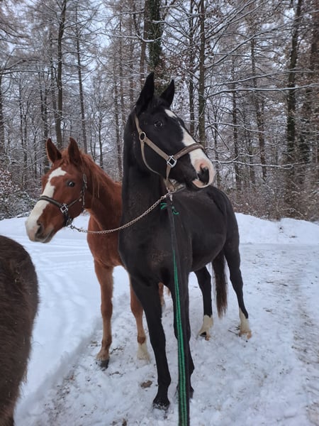 Er ist vom ersten Tag bis zum Anreiten in einer Hand gewesen, immer in einer Herde, mit jungen und auch mit älteren Pferden zusammen. Bis einschließlich Sommer bzw. Frühjahr 2025 war er Sommer wie Winter im Offenstall und konnte rein und raus zu jeder Zeit. Außer bei der Kastration hatte er noch keinen Tierarzt gebraucht. Ab diesen Sommer ist er unter dem Sattel, er ist ein Pferd mit Temperament und sehr guten Gängen. Unter dem Sattel zeigt er sich von seiner besten Seite, brav und lehrreich.