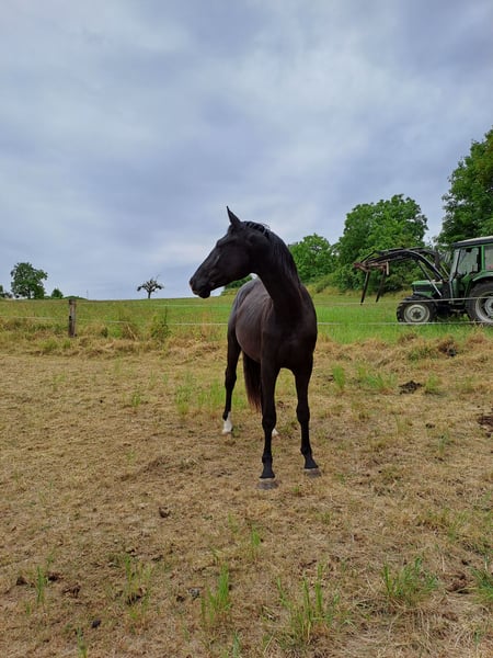 Er ist vom ersten Tag bis zum Anreiten in einer Hand gewesen, immer in einer Herde, mit jungen und auch mit älteren Pferden zusammen. Bis einschließlich Sommer bzw. Frühjahr 2025 war er Sommer wie Winter im Offenstall und konnte rein und raus zu jeder Zeit. Außer bei der Kastration hatte er noch keinen Tierarzt gebraucht. Ab diesen Sommer ist er unter dem Sattel, er ist ein Pferd mit Temperament und sehr guten Gängen. Unter dem Sattel zeigt er sich von seiner besten Seite, brav und lehrreich.